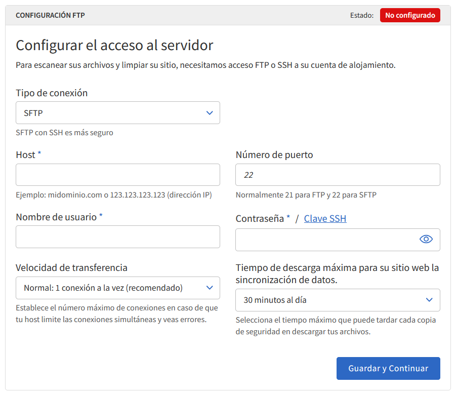 5.- Ingrese los datos FTP para la conexión al servidor los cuales son: Nombre del servidor, puerto, usuario FTP y la contraseña. Se recomienda que maneje un usuario FTP solo para su sitelock.