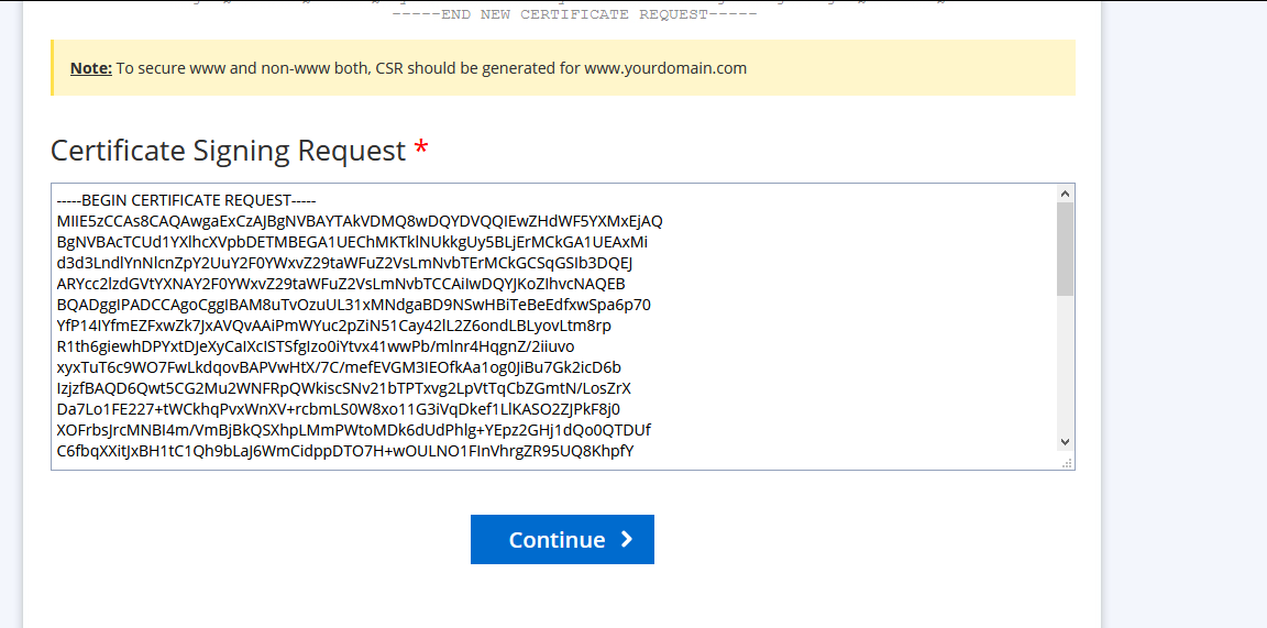 4.- Este código se pega en el formulario de configuración en donde está generando su certificado SSL y haga clic en el botón Continue