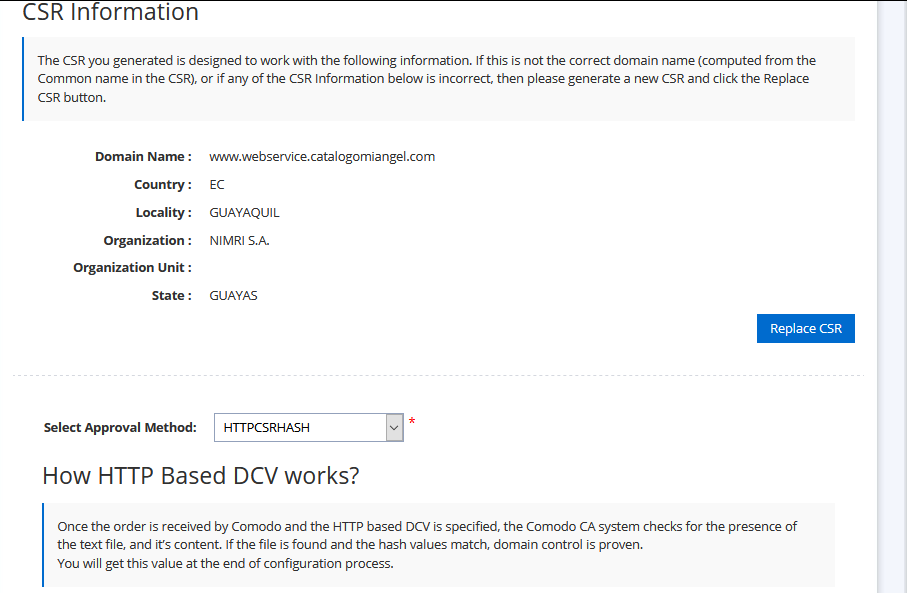 5.- Se escoge el método de aprobación del certificado SSL, por ejemplo, HTTPCSRHASH y se llena los campos con los datos del usuario