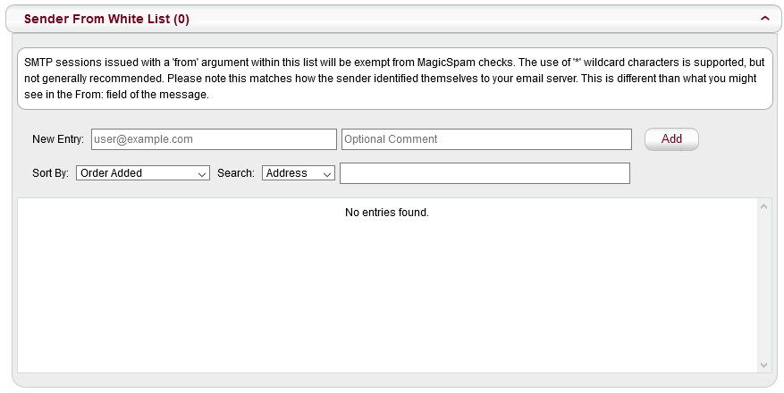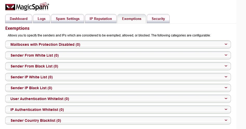 - Lista blanca de autenticación de usuario: Las sesiones SMTP emitidas con un argumento de usuario ‘AUTH’ dentro de esta lista estarán exentas de las comprobaciones de seguridad de MagicSpam.
