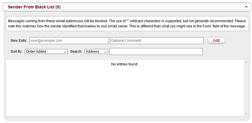 - Lista negra de remitentes: Los mensajes procedentes de estas direcciones de correo electrónico serán bloqueados.