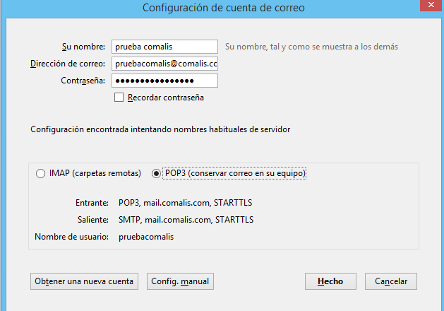 5.- Una vez completado los datos, haga clic en «Volver a probar» y si está todo correcto, se le habilitará el botón de «Hecho» y listo, ya tiene configurada su cuenta.