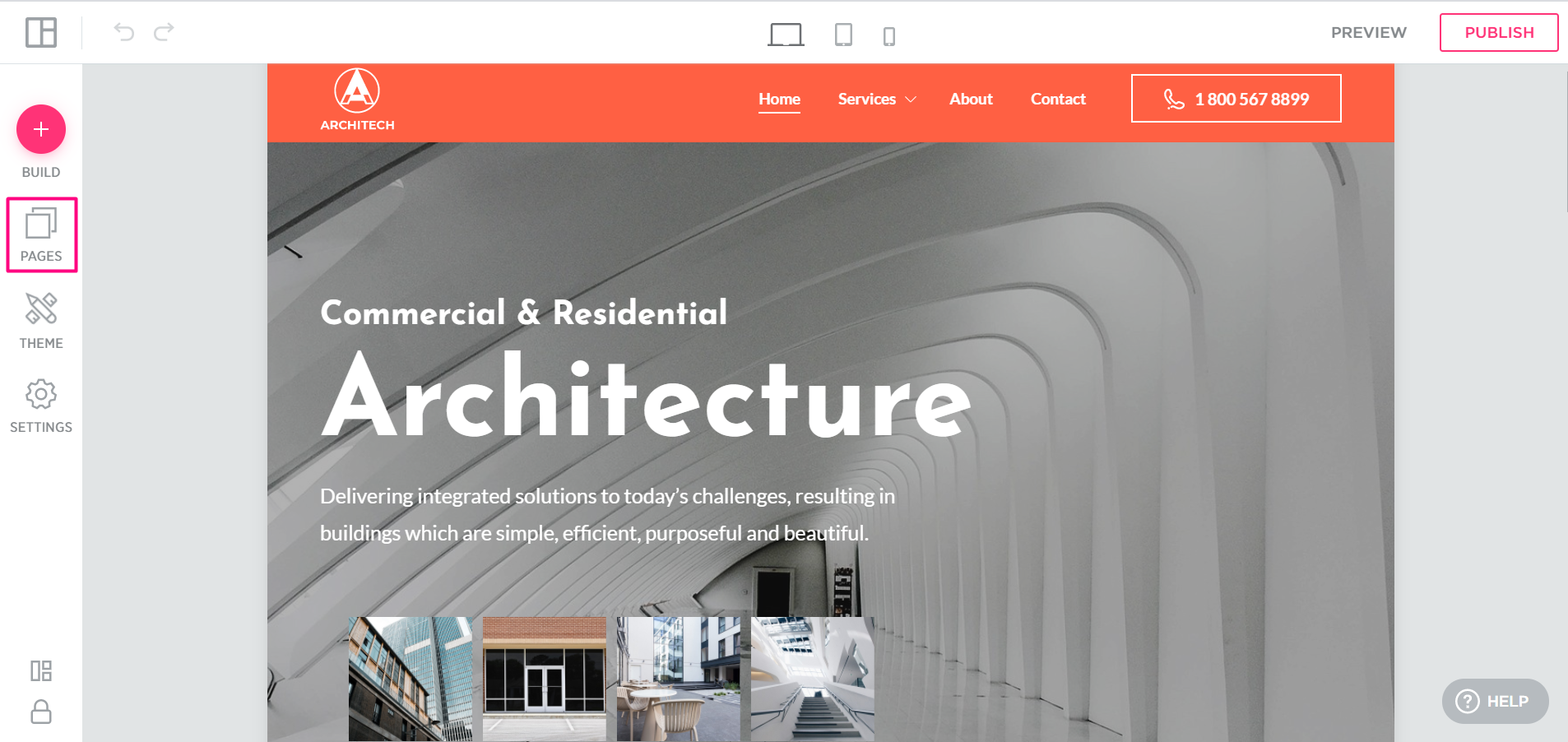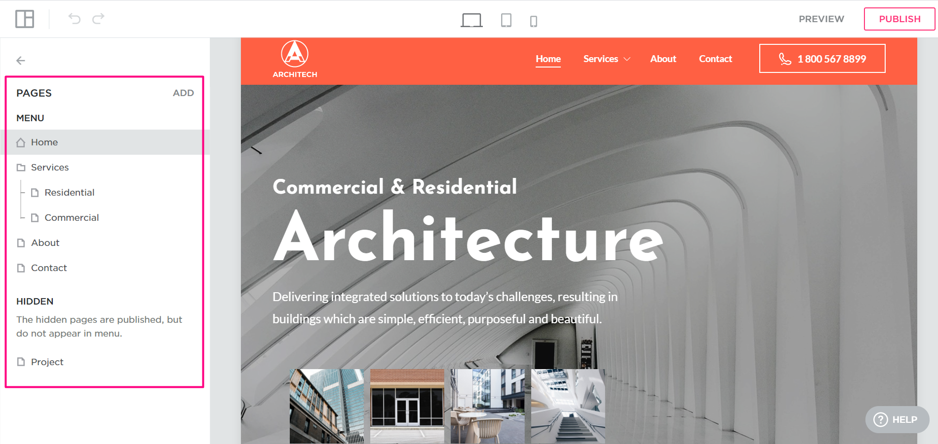 Haga clic en el icono PAGES en el Site Builder para administrar la estructura del sitio que está creando: reorganizar páginas, crear subpáginas, seleccionar una página de inicio, cambiar el nombre, ocultar y mostrar páginas, cambiar las URL de las páginas, duplicar páginas, agregar páginas en blanco, agregar páginas de otras plantillas, agregar carpetas y vínculos, eliminar páginas y realizar otras funciones.