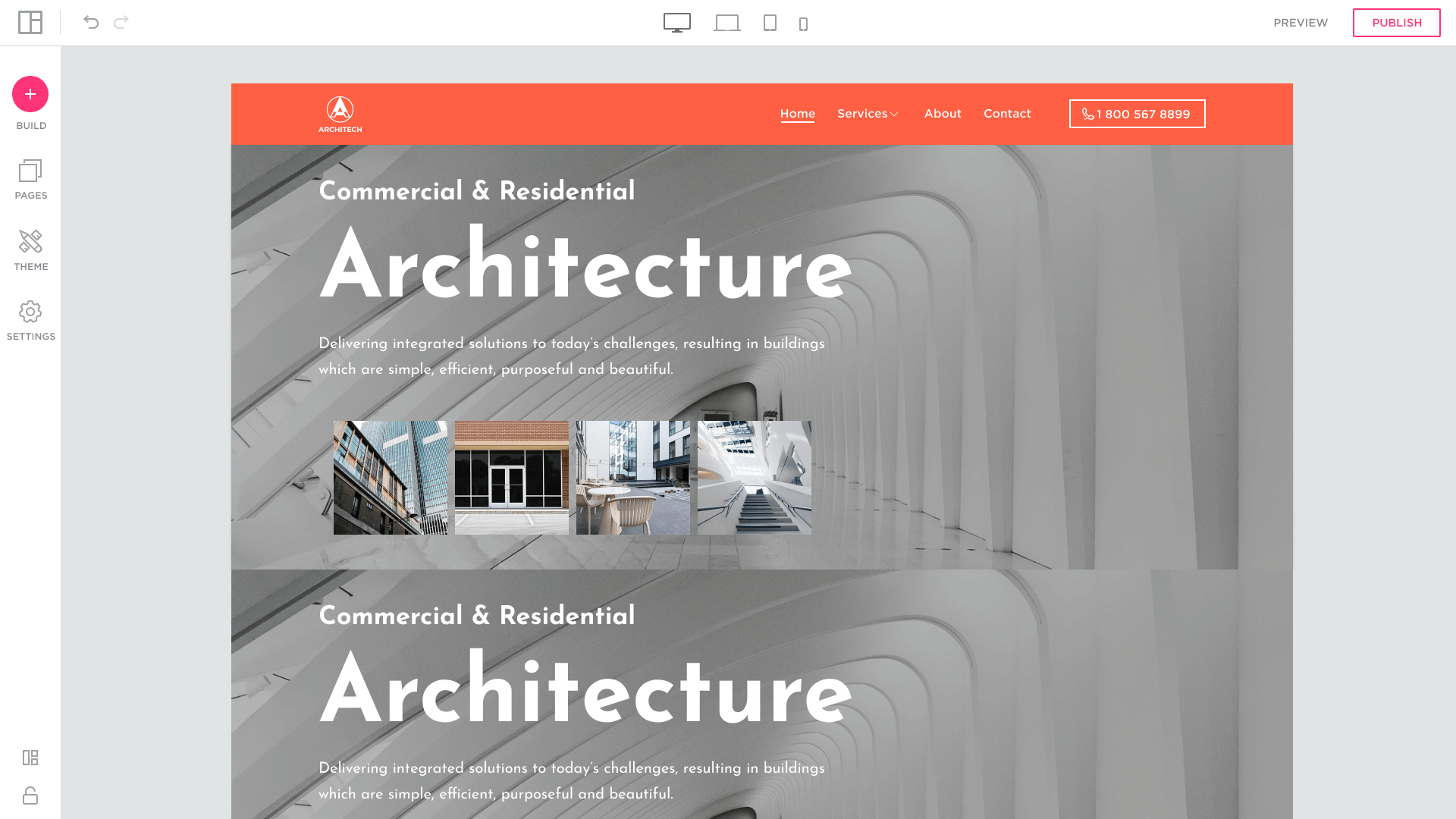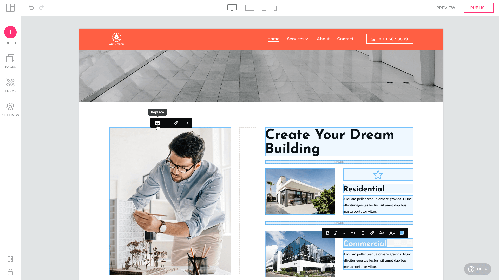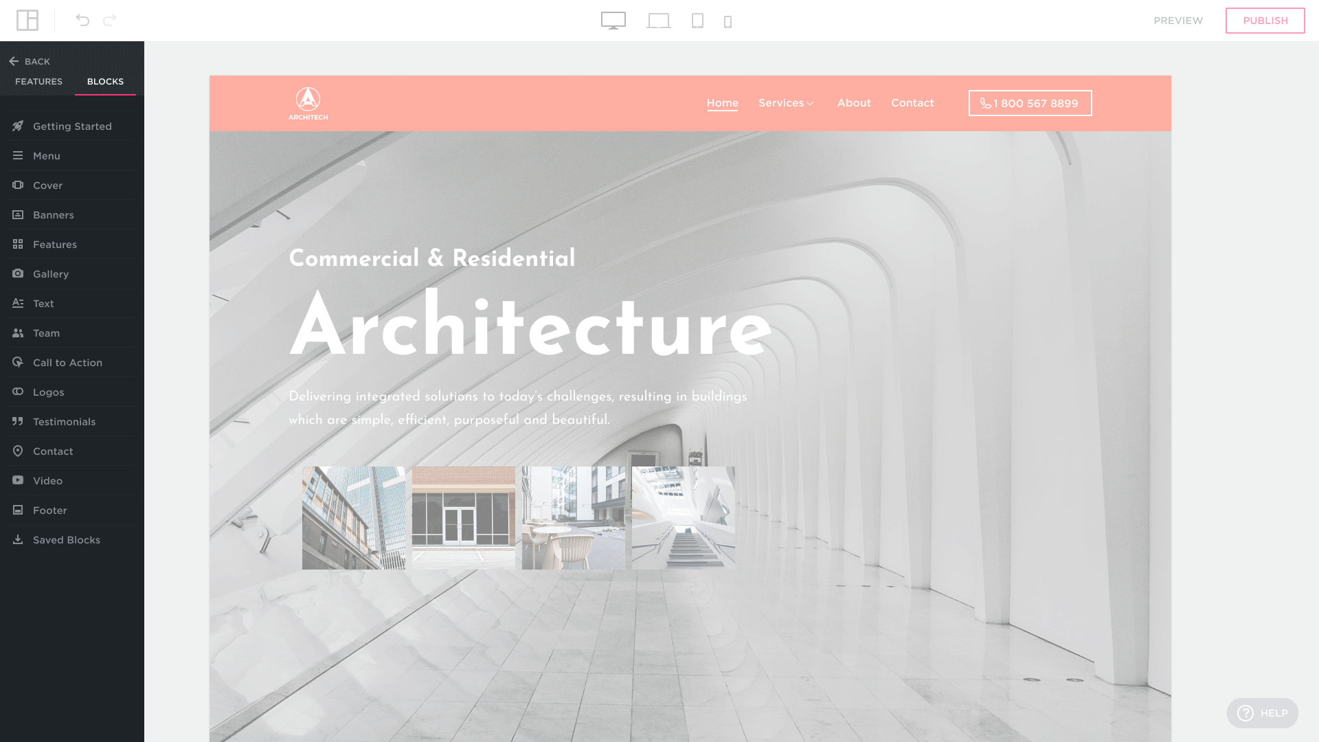 Un bloque (BLOCK) consiste en un conjunto de elementos configurables (botones, iconos, fotos, elementos de texto, formularios) llamados Features en el Site Builder. Haga clic o seleccione una función para mostrar el menú para modificar el elemento.