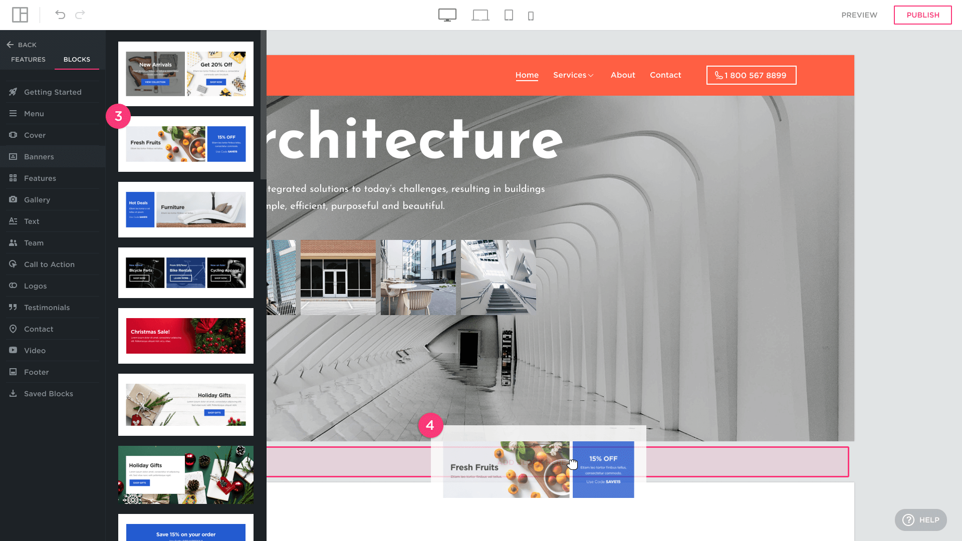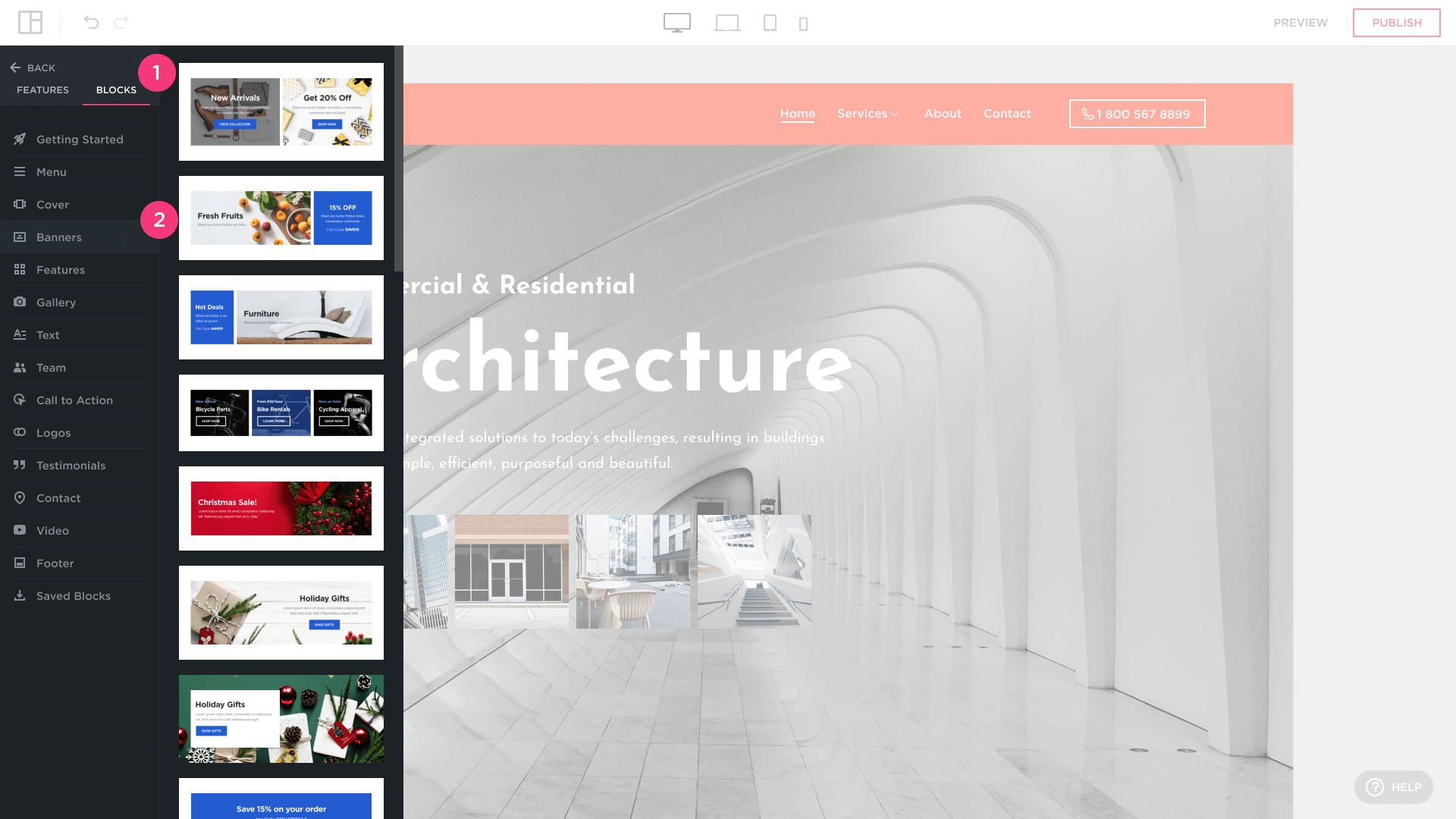 En un diseño de sitio web, un bloque es una sección lista para usar que puede usar para crear su sitio web, como un banner, pie de página, precios o sección de contactos.